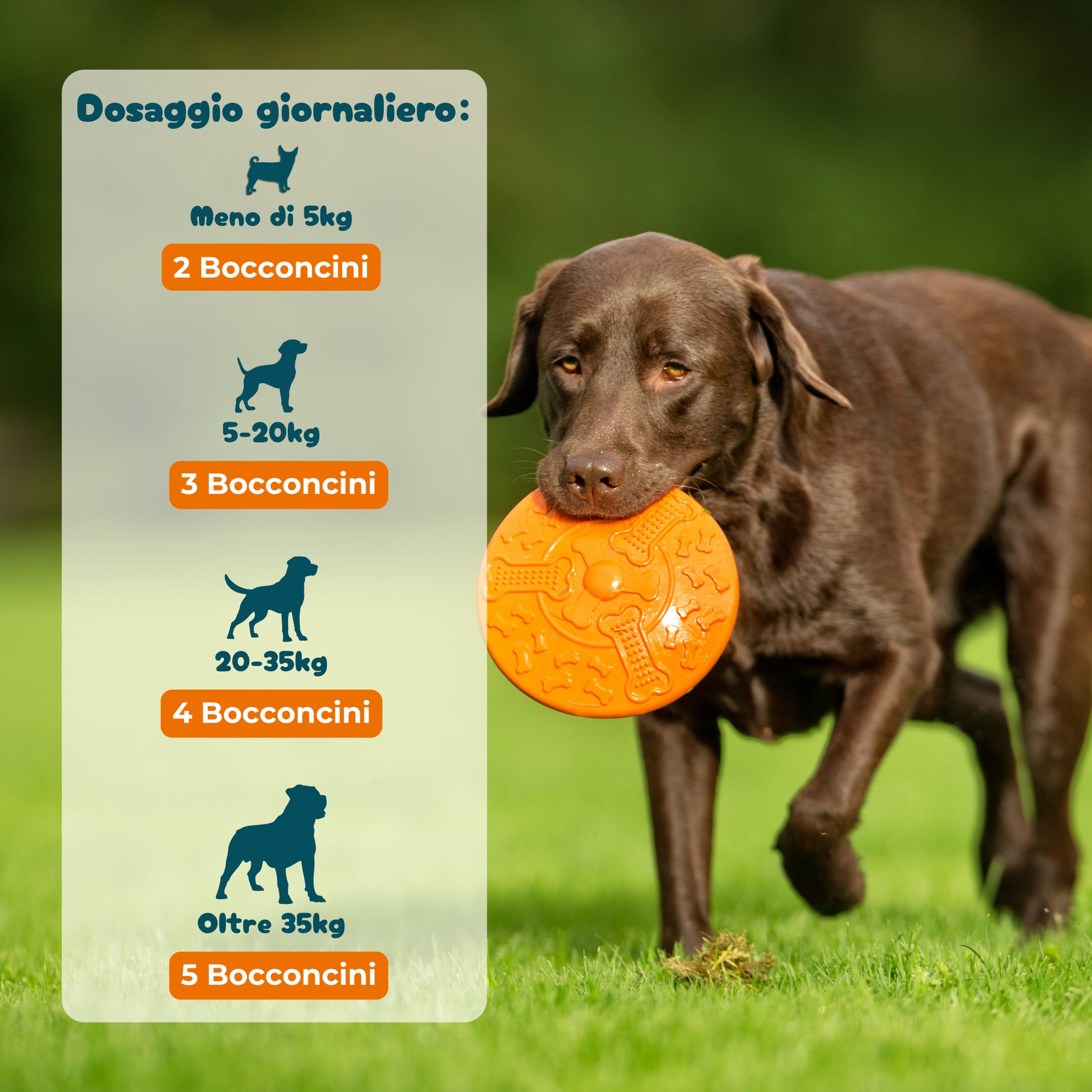 - Oltre 35 kg: 5 bocconcini al giorno.