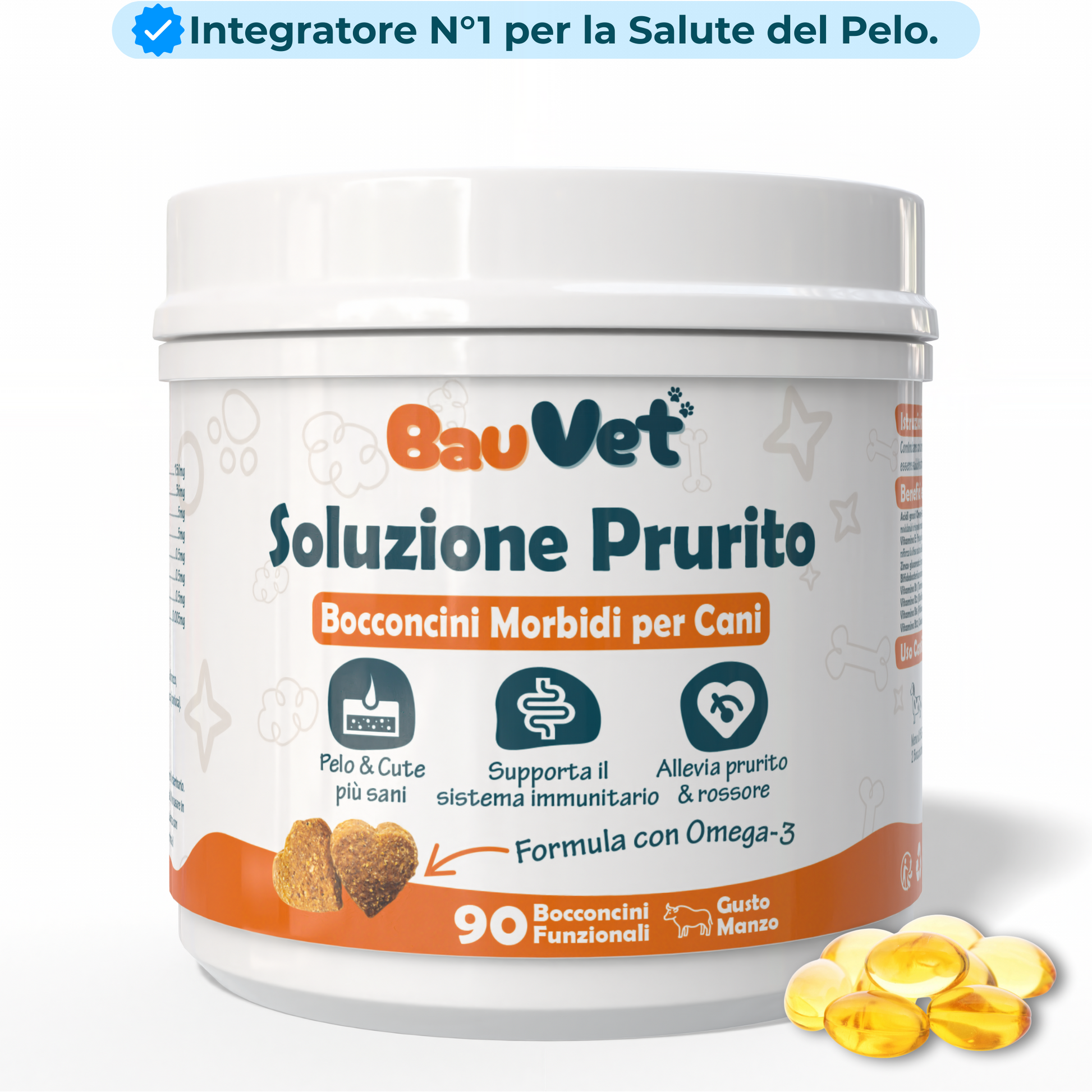 Mantieni pelo e cute sani e aiuta il tuo cane a ritrovare benessere grazie a BauVet Soluzione Prurito, l’integratore in morbidi bocconcini dal gusto manzo, formulato per alleviare prurito e rossore e sostenere il sistema immunitario.